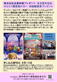 株式会社全農林様より、名古屋市内のひとり親家庭の親子を対象に映画「インサイドヘッド2」と映画「パウパーティーinシアター」の映画鑑賞券(ムビチケカード)を各75組合計300名様分ご寄贈いただきました。ご希望の方はメールフォームよりお申し込みください。
