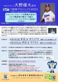 2012年7月11日プロ初勝利の日、中日ドラゴンズのエース大野雄大投手は“ウイニングボールは誰にあげる?“というインタビューに『母親です。プロに入るまで僕のことを女手ひとつで育ててくれたので、一つ恩返しができました。』と観客が皆、感動したコメントでした。ご自身と同じ境遇のひとり親家庭の親子が、生のプロ野球に触れて、笑顔いっぱいになってもらいたいという、大野雄大投手の熱い想いから、このプロジェクトが始まり7年目を迎えました。このプロジェクトは、株式会社中日ドラゴンズ様が、社会福祉法人愛知県母子寡婦福祉連合会を通じて実施するものです。