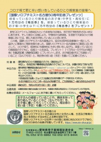 この度、国際ソロプチミスト名古屋様より、設立50周年記念事業の一環として、温かいご厚意のご寄附を賜りました。国際ソロプチミスト名古屋様のご意思に近い形として、コロナ禍で、経済的にも精神的にも辛い想いをしながら、頑張っているひとり親家庭の子どもに、応援エールを送る、プレゼント!『1万円分・5千円分の商品券』を各250名(合計500名)にプレゼントします。お子様自身が日ごろ頑張っていること(なんでも可)と、商品券の使い道(予定)を書いてご応募ください。