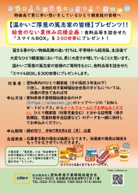 【温かいご厚意の篤志家の皆様】プレゼンツ!!給食のない夏休み応援企画:食料品等を詰合せた「スマイルBOX」を300世帯にプレゼント!【8/4(月)必着】(締め切りました)(8/15発送済)
